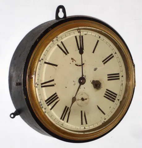 English marine lever 8 day wall clock in cast iron case with cast brass bezel, c1900 original painted dial with second's bit above 6 has minor flaking around winding arbor. It is ticking briskly. Diameter 9 1/2"