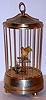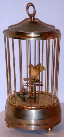 Music box playing "Jingle Bells" with bird in brass cage and mechanical movement, the bird pivots from perch to perch as tune plays, c1960