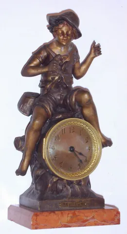 A French statue of "Pecheur, Par F. Moreau Med. d'or", now with a Seth Thomas back wind 30 hour movement married to the case. Note the boy's fishing pole is missing.