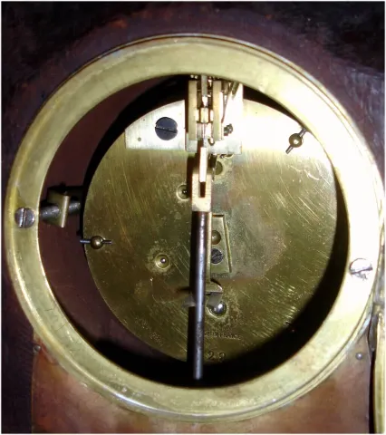 Beautiful floral carved wood case, intact except for some small chipped leaf edges. Hand-painted multi-color porcelain dial has small cracks by 1. Thick beveled glass is fine. Unsigned, but marked "Made in France" movement ticks but could use service. Ht.14.5".