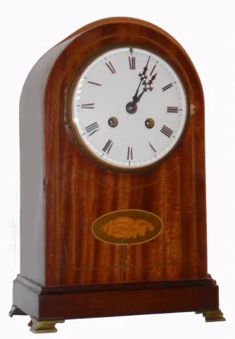 Samuel Marti, Paris French mantel clock 8 day time and strike movement in mahogany veneer case inlaid with shell design, c1900