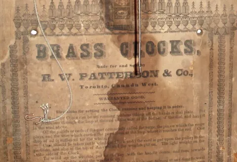 R. E. Patterson and Co., Toronto, Canada West, C. 1850, 30-hour time/strike/alarm weight driven column and cornice shelf clock. Refinished mahogany veneered case in nice clean condition with some small veneer loss on the base. Original painted dial has some minor paint loss, a little wear and some stains. Hands fit movement but appear to be a later style and may not be original. Conn' brass movement had a name stamped on the front plate that was scratched out. This could have been done by the Toronto firm as the scratch marks are old; mov't appears original to case. Tablet is original with some minor flaking. Label is a little dark / faded but readable. Note alarm winds at 6:30. Height 26 inches.