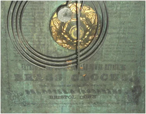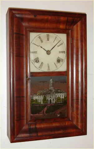 Nicely refinished case with no losses to front veneer, only small chip on side bottom. Old reverse-paint glass of Hartford Statehouse with some losses. Original green inside paper label. Movement, with original brass mainsprings, ticks and strikes. Metal dial may be old repaint with some number strengthening and losses around winding holes. Ht.17".