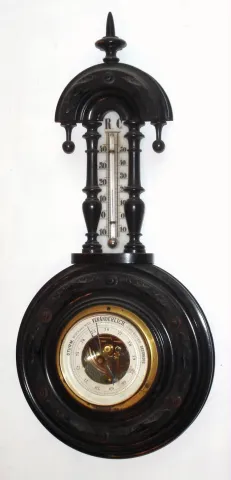 German, wall mounted Aneroid barometer and thermometer. This thermometer is unusual in that it uses the Celsius and Reaumur scale. The Reaumur scale was invented in 1730 by Rene Reaumur and had wide spread use in Europe in the 18th and 19th century, c1880