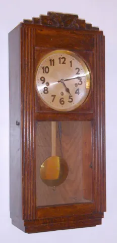 Stained oak case in nice clean condition in an original finish. Silvered dial is clean with some scratches. Hands and pendulum are original. Large and...