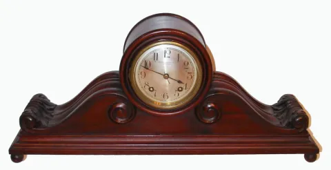 German, 8-day time and gong strike, platform escapement, spring movement, tambour style mantel clock retailed by S. Nordlinger and Son, Los Angeles, C. 1920