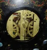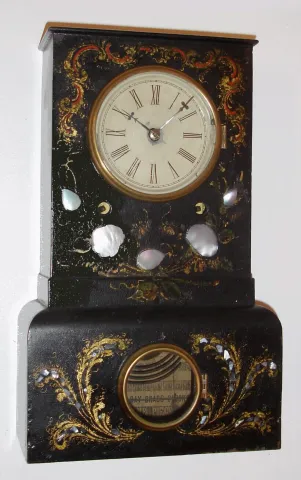 Morse and Co., Plymouth Hollow, Conn., inlaid black iron 8-day time and strike mantel clock. C.1855. Very good original condition metal case with inlaid MOP and gold/red decoration. Original painted dial with tiny losses. Clean movement stamped "Morse No. 1", ticks and strikes. Very good inside paper label on wood backboard. Ht.14".