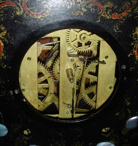Morse and Co., Plymouth Hollow, Conn., inlaid black iron 8-day time and strike mantel clock. C.1855.