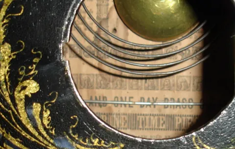 Very good original condition metal case with inlaid MOP and gold/red decoration. Original painted dial with tiny losses. Clean movement stamped "Morse No. 1", ticks and strikes. Very good inside paper label on wood backboard. Ht.14".