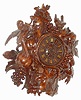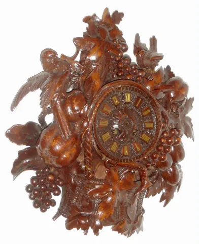Swiss, probably Interlaken area, Black Forest style carved wooden cartel clock, with grapes, pomegranate and plums amid leaves and with birds at top, fitted with a French, Vincenti 8-day time and bell strike movement. a well carved case. A leaf on the bottom right side has a couple of small pieces broken off. Another side leaf has tip broken off. There are also a couple of repairs. Large bird on the left has upper part of its beak broken off. One of the top leaves has a small piece broken off. Hands are missing. Hook for the pendulum needs to be soldered to affect a repair. Mov't with unusual anchor trademark. Ht. 16