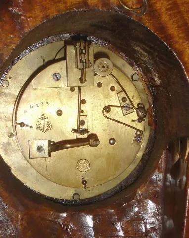 a well carved case. A leaf on the bottom right side has a couple of small pieces broken off. Another side leaf has tip broken off. There are also a couple of repairs. Large bird on the left has upper part of its beak broken off. One of the top leaves has a small piece broken off. Hands are missing. Hook for the pendulum needs to be soldered to affect a repair. Mov't with unusual anchor trademark. Ht. 16