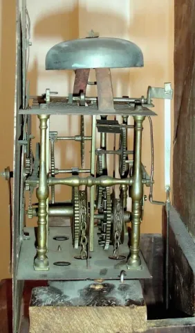 Early Pennsylvania tall clock with endless chain winding, moon phase date and bell strike, nicely turned/ detailed pillars, 30 hour, c1825