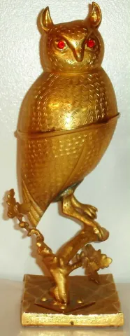 Music box Swiss, playing 2 tunes - Fledermaus and Skater's Waltz set within gilt owl figure with jewel set eyes, perched on limb, c1925 music box not functioning, gilding in very good condition. Ht 12 1/4"