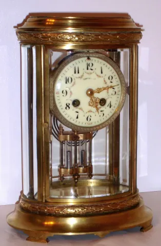 French, Marti, 8-day time and gong strike brass and glass crystal regulator retailed by Tiffany and Co, an oval case with acanthus bands surrounding the top and base, and with 2-vial compensating pendulum, C. 1900 Polished oval case in clean condition. Original porcelain dial has a minor dark hairline under numeral 3, and part of the Tiffany signature is worn off. Fancy hands are original. Movement is signed. The front door has a small chip on the corner of the beveled glass. The other glass panels are fine. Overall very good condition. Height 11.5 inches