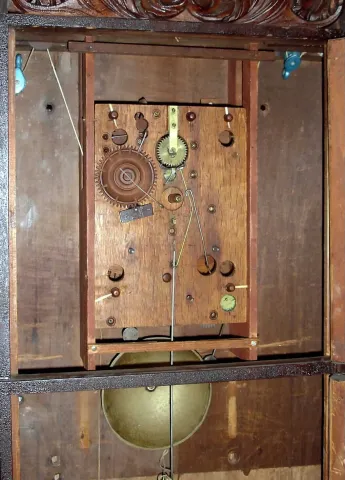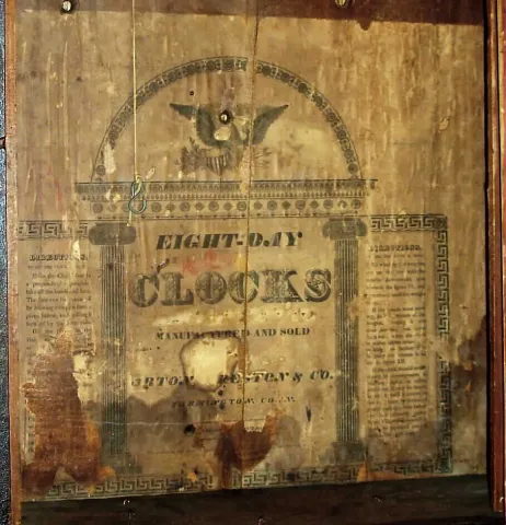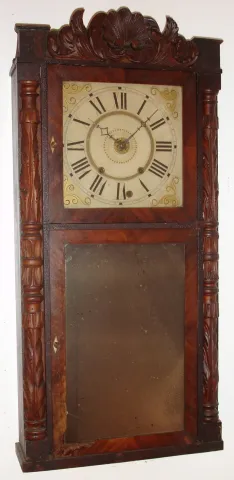 Orton, Preston and Co., Farmington, Conn., carved column and splat 8-day wooden works weight-driven shelf clock with alarm. C.1836.