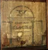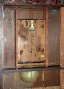 Mahogany case in original old crazed-bubbly finish, with a few veneer losses and small chips on top carvings. Old mirror tablet cracked across bottom left, both glasses retained by newer-looking wood strips. Unusual 3-train wood alarm movement looks clean and complete. Large brass bell. Wood dial in very nice condition with fancy gilt-gesso corner spandrels. Ht.39".