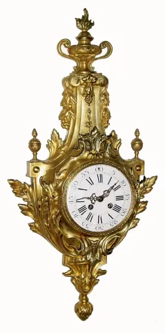 French, Vincenti, brass cased cartel clock, 8-day time and bell strike movement, c1890 the case is in good condition with flame urn finial on top. The porcelain dial has no hairlines. Height 25 inches