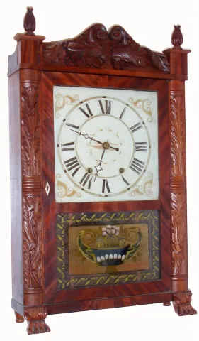 Mark Leavenworth and Co., Waterbury, Conn., C. 1832, 30-hour time/strike wood movement carved half column and splat shelf clock. Stripped mahogany veneered case in nice condition. Unusual carved columns being almost flat. The nicely carved paw feet and turned back feet are later replacements. Pineapple finials look to be modern replacements. Unusual tablet with some loss appears to be original. Painted dial has some wear and paint loss. Hands are original. Movement is the proper type. Height 28 inches