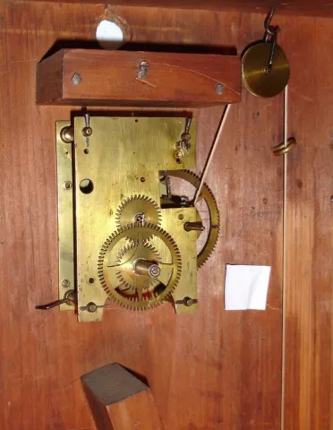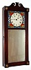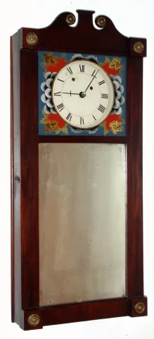 Chandler type "New Hampshire Mirror" wall clock 8 day time and alarm weight driven movement in mahogany case with reverse painted upper glass and mirrored tablet, c1820, as-found