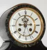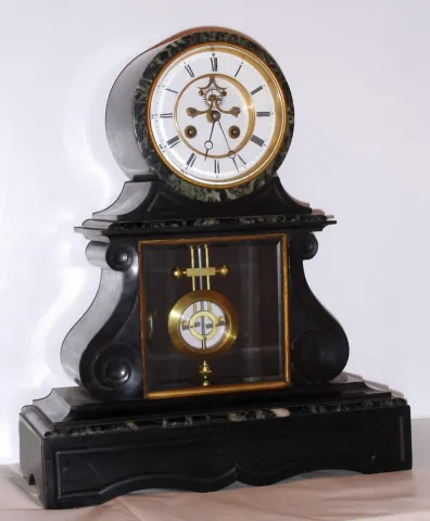 French, Marti and Cie, 8-day time/strike black with contrasting green and white marble mantel clock, with open escapement and visible Ellicott style compensating pendulum, C. 1900 Marble case in very nice condition with just a little roughness on one spot of the round head. Original porcelain dial has a couple of tiny chips at the slow/fast arbor. Hands are original. Pendulum may have had a glass crystal over the compensation levers, is OK without. Movement is signed. Height 17.5 inches.