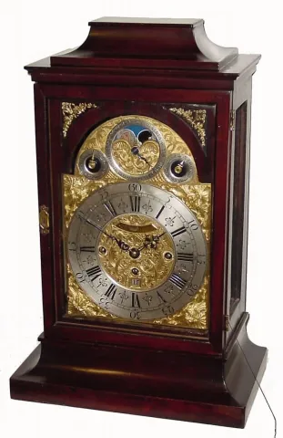 M. Bentwe, in Wien, Austrian bracket clock with calendar and moon phase 56 hour time and quarter strike crown verge movement in hard wood case with silvered chapter ring and unusual north wind brass spandrels and mock pendulum aperture, c1750, chain fusee for time train, backplate engraved in the English manner. the front door and the base are replacements and newer reinforcement has been relieved to accommodate pendulum swing. The case is in the usual Austrian style, probably ebonized originally, now stripped down to its mahogany colored base. This three train clock at one time had an English style pull quarter repeat, those pieces missing and no longer operational. The movement brackets are new; wooden shims added to stabilize movement. Overall, this is a good looking 18th century clock with restorations. Note the movement with heavy balluster pillars and robust construction. Height 20 inches
