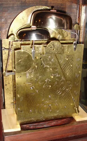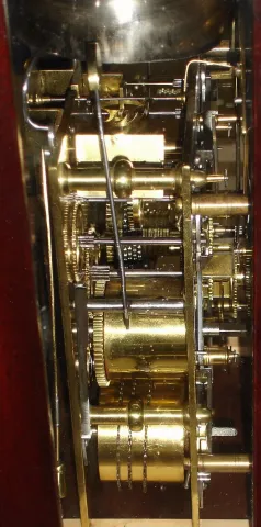the front door and the base are replacements and newer reinforcement has been relieved to accommodate pendulum swing. The case is in the usual Austrian style, probably ebonized originally, now stripped down to its mahogany colored base. This three train clock at one time had an English style pull quarter repeat, those pieces missing and no longer operational. The movement brackets are new; wooden shims added to stabilize movement. Overall, this is a good looking 18th century clock with restorations. Note the movement with heavy balluster pillars and robust construction. Height 20 inches