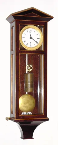 Austrian "Dachlur" reproduction of early Biedermeier style wall clock, miniature with 2.3" porcelain dial, one day duration, weight driven, modern c2000 like new, this nice looking clock has original hand rubbed shiny finish over mahogany veneer case with satin wood banding. Original steel rod pendulum, spoked pulley, fancy cast bezel, and beat scale intact. Hard to explain how attractive it is. Height 16.5 inches