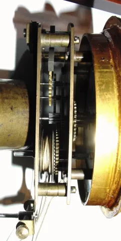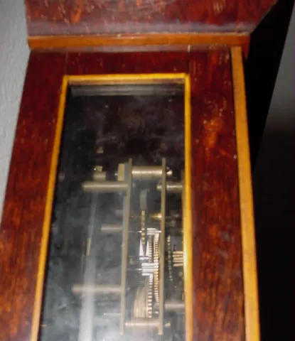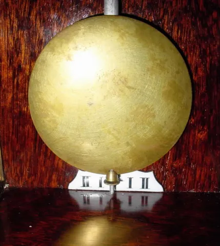like new, this nice looking clock has original hand rubbed shiny finish over mahogany veneer case with satin wood banding. Original steel rod pendulum, spoked pulley, fancy cast bezel, and beat scale intact. Hard to explain how attractive it is. Height 16.5 inches