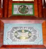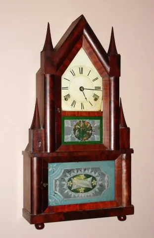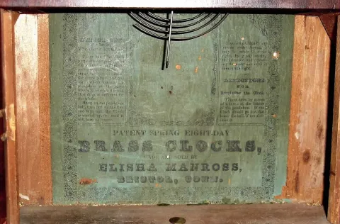Elisha Manross, Bristol, Conn, double steeple 8 day time and strike spring driven double fusee mvt in mahogany veneered case on ball feet with reverse painted tablets, c1845. Note heavy strap brass movement with heavy cast iron bracket for spring barrels.