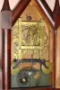 the finish is original and has been well rubbed down and there are two veneer repairs, one on the rear of the steeple and a mismanaged repair to the right of the door. The two rear ball feet are replacements. The dial is original and in great condition with little loss or flaking and the well detailed tablets are also original and excellent with little loss. Height 27 inches