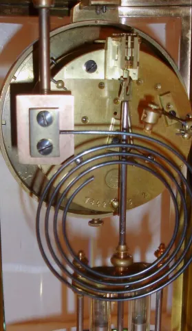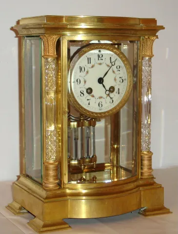 French, Samuel Marti, 8-day time and gong strike brass and glass bow front with fancy glass crystal columns, and bow front, crystal regulator, C. 1900 Polished brass case in overall fine condition with a slight tarnish. Beveled glass panels are fine. Original porcelain dial has fancy polychrome floral decorations, and is perfect and the hands are original. Overall fine condition, mov't recently serviced and running well. Height 12 inches