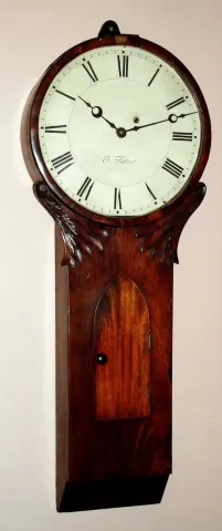 E. Taber, Roxbury style tavern clock in a mahogany case with carved accents below the dial, with a later time only weight movement, c.1810