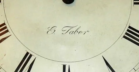 E. Taber, Roxbury style tavern clock in a mahogany case with carved accents below the dial, with a later time only weight movement, c.1810 euphoria over the great look on this clock is compromised when you remove the dial to reveal that the movement has been changed to a slightly later one. You can see that it was originally a striker, a circular pattern and scars from the original bell, and the case back to the right of that has been cut out for a hammer. There are some veneer chips in the bezel above 12. The dial has been repainted. Would be closer to $8000 if the movement was original. Height 36 inches