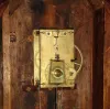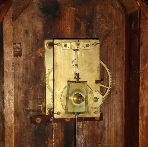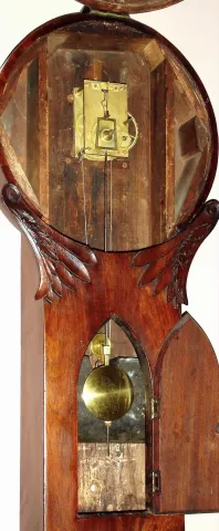 euphoria over the great look on this clock is compromised when you remove the dial to reveal that the movement has been changed to a slightly later one. You can see that it was originally a striker, a circular pattern and scars from the original bell, and the case back to the right of that has been cut out for a hammer. There are some veneer chips in the bezel above 12. The dial has been repainted. Would be closer to $8000 if the movement was original. Height 36 inches
