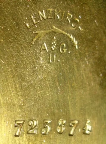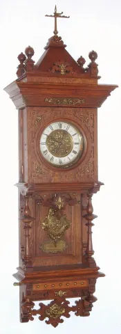 German, Lenzkirch, oak cased wall clock, the lower case with full turned columns and open-well construction showing the pendulum in full view, and the case with profuse bronze trimmings, c.1880, serial 723874 the case has an old refinish. The small fleur-de-lis carving below the center splat appears to be made to match, and is well done. The dial is in very good condition minor discoloration around 7 from setting the hands. Mov't is properly signed with Lenzkirch logo, and is running. Height 42 inches