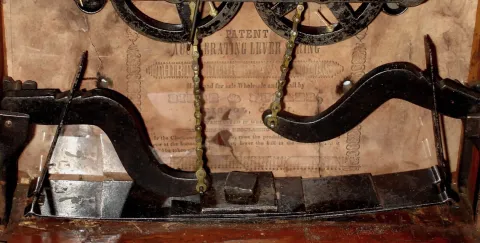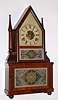 Birge and Fuller, Bristol, Conn., wagon spring mov't in "Single Candlestick Sharp Gothic" on frame, mahogany veneer case, 30 hour time and gong strike, c1845