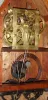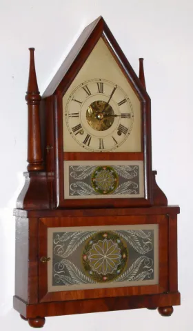Birge and Fuller, Bristol, Conn., wagon spring mov't in "Single Candlestick Sharp Gothic" on frame, mahogany veneer case, 30 hour time and gong strike, c1845 original finish rubbed and cleaned. The zinc dial is correctly redone. The matched pair of glass tablets are finely repainted, and are excellent See page 228 in Kenneth Roberts "Connecticut Clock Technology 1810 - 1862" for similar example. Boardman supplied upper movements to Birge and Fuller. Note label is still full, but has faded; it is legible. Height 22 inches