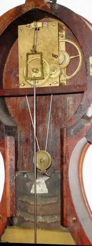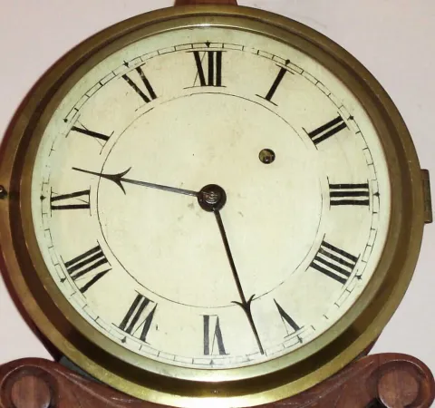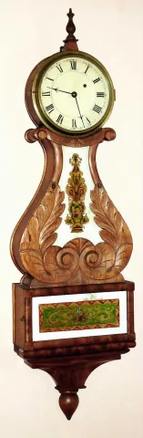 A Boynton, Boston (attributed) lyre banjo weight driven time only wall clock, mahogany case with carved throat, c1837