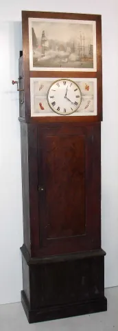 German tall case "organ or flute clock", 3-piece dial with painted scene of naval battle above round metal dial, time and strike weight driven movement in grain painted case with faux-grain burled door, 8-tune c1850