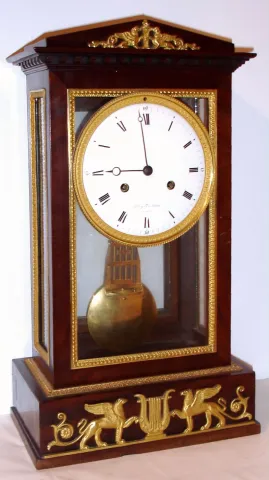 French, "LeRoy, Horologer de Madame, Paris", 8-day time/strike silk thread suspension clock, in an architectural mahogany case with bright ormolu mounts, C. 1810 Fine mahogany case with ormolu mounts in very nice condition in an old finish. The rear glazed door with restoration. Original porcelain dial is perfect and the hands are original; good Le Roy signature on dial. Nice lyre form grid iron compensating pendulum. The movement properly signed and with number 939. Height 20 inches.