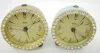 3 Decorative Metal Keywind Alarm Clocks: 1.) Marked Ronson; metal tombstone style case with applied and painted flowers. 2.) 2 Linden Blackforest round clocks with rhinestone frames, 1 gold, 1 light blue. Tallest 5"; All running at this time.