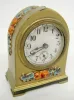 Group of 3 Decorative Metal Keywind Alarm Clocks 3 Decorative Metal Keywind Alarm Clocks: 1.) Marked Ronson; metal tombstone style case with applied and painted flowers. 2.) 2 Linden Blackforest round clocks with rhinestone frames, 1 gold, 1 light blue. Tallest 5"; All running at this time.