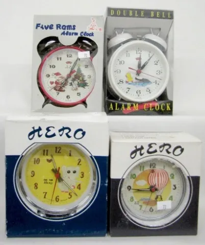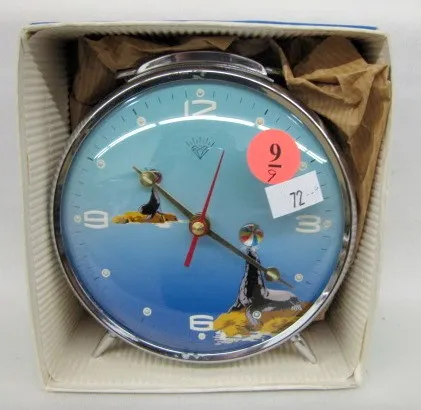 9 Animated Alarm Clocks: all with original boxes. 1.) Animated alligator bell top. 2.) Animated Santa and bunny bell top. 3.) Animated woodpecker 4.) Hero animated eye. 5.) Animated boxers; bell top. 6.) Hero animated puppy. 7.) Lux animated steamship; bell top. 8.) Diamond animated seals with beach ball. 9.) Peter Made in Germany animated soccer players. Not tested.