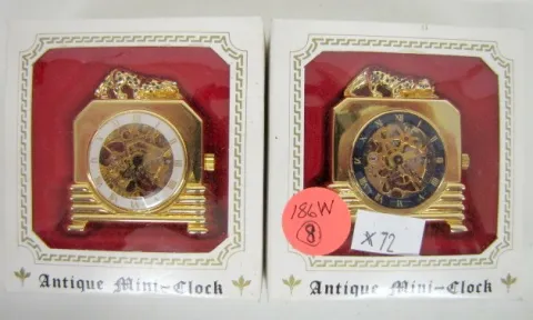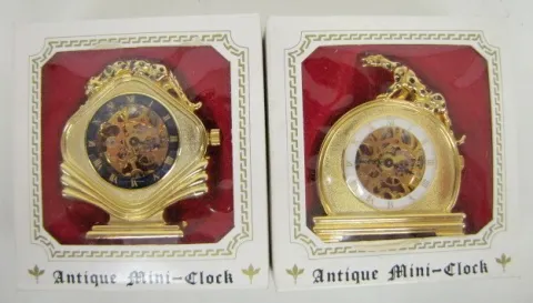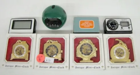 8 Clock Related Items: 4 antique miniature clocks in original boxes; JS and A Time Ball in original box; Avon on the go travel alarm clock in original box; 2 other digital clocks. Not tested for running condition; all sell in as is, as found condition.
