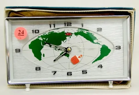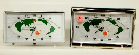 2 Diamond Alarm Clocks: Earth clock faces with orbiting second hand and animated space shuttle; 1 with original box; both working. 4" x 7 3/4"