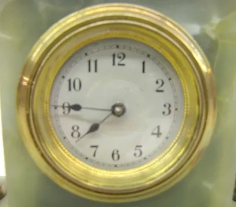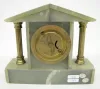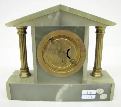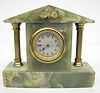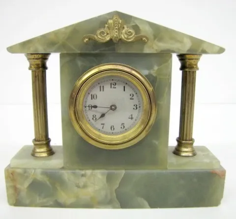 German Green Onyx Dresser Clock: pillar and architectural shape; all brass trim; 1 3/4" metal dial; not tested. (Minor chips on bezel; minor chips on ...