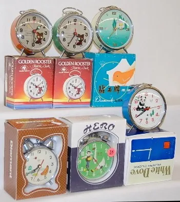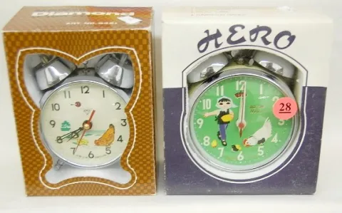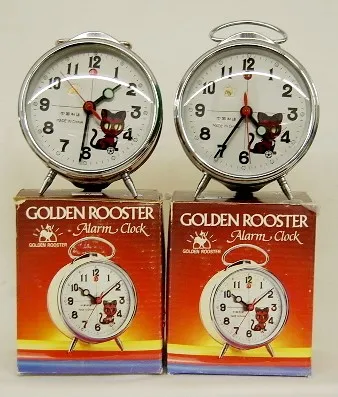Group of 6 Comic Character Alarm Clocks 6 Comic Character Alarm Clocks: all in original boxes; not tested. 1.) Hero animated girl feeding chicken alarm. 2.) Foreign animated panda alarm. 3.) Reveille Matin bird alarm. 4.) Diamante animated chicken alarm. 5.) 2 Golden Roaster animated cat alarms.