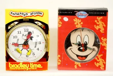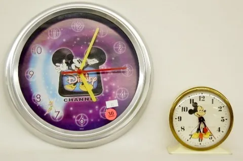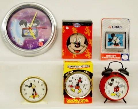 6 Disney Mickey Mouse Clocks: 1.) Disney Channel battery operated. (No battery.) 2.) Mickey alarm with his arms as clock hands. 3.) Mickey 2-bell alar...