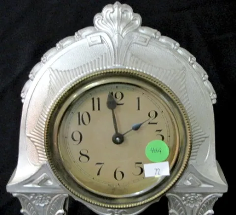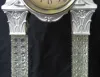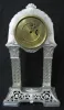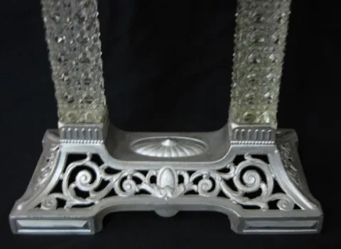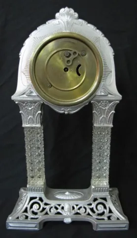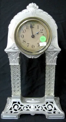 German Metal and Crystal Pillar Clock: marked metal painted dial; glass button pillars; metal cutout base with metal around clock. (Not running.) 15 1...