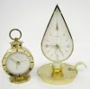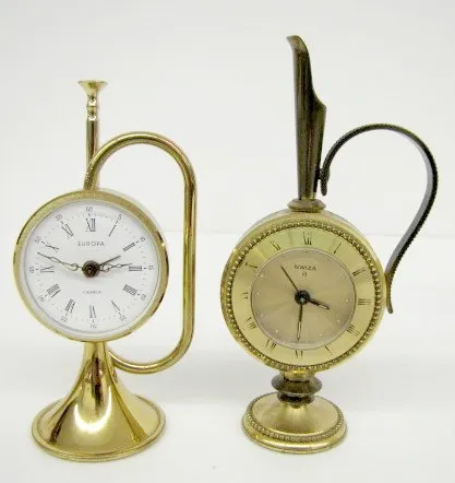 Group of 7 Brass Novelty Desk and Alarm Clocks Group of 7 Brass Novelty Desk and Alarm Clocks: Lux with fancy dial; Bulova music box clock, Swiss (not working); Europa 7 jewels, Germany, Coronet; Semca 7 jewels Swiss candlestick; Looping 15 jewels alarm, 8 day Swiss; Swiza 8 day Swiss, ewer; Semca alarm. Tallest 7 1/2"
